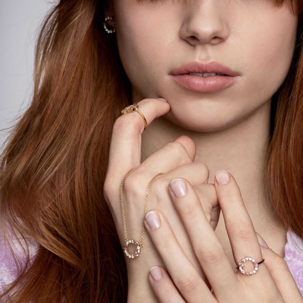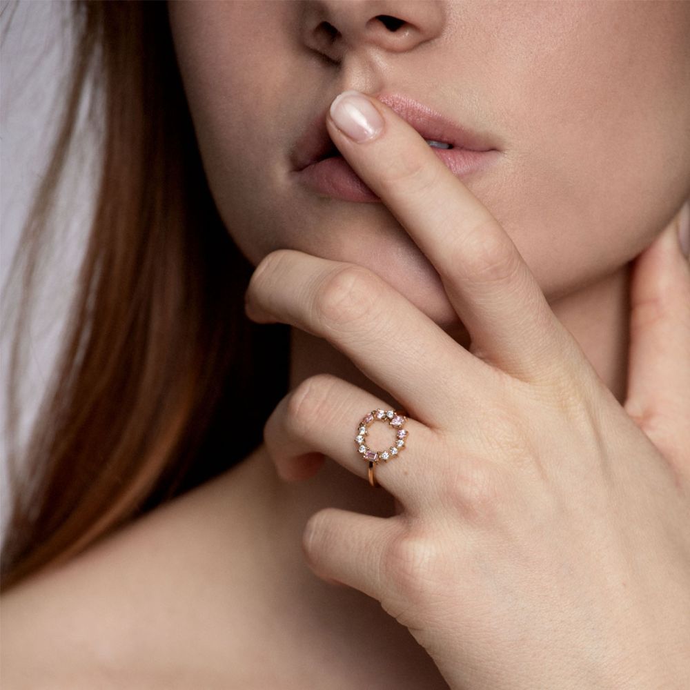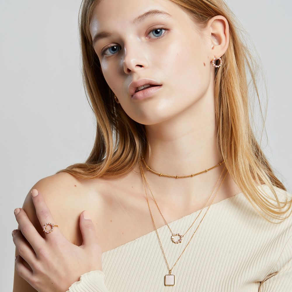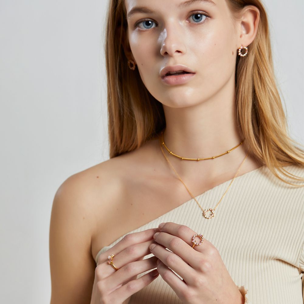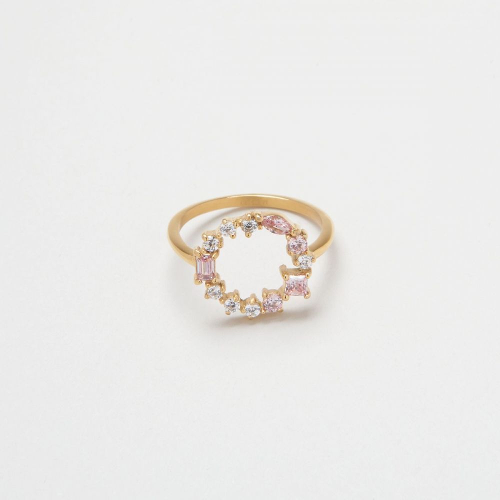 经典圆形的现代诠释:由不同的形状的宝石组成的圆簇。 此款戒指是由18k金镀金不锈钢手工制成,搭配施华洛世奇宝石。
