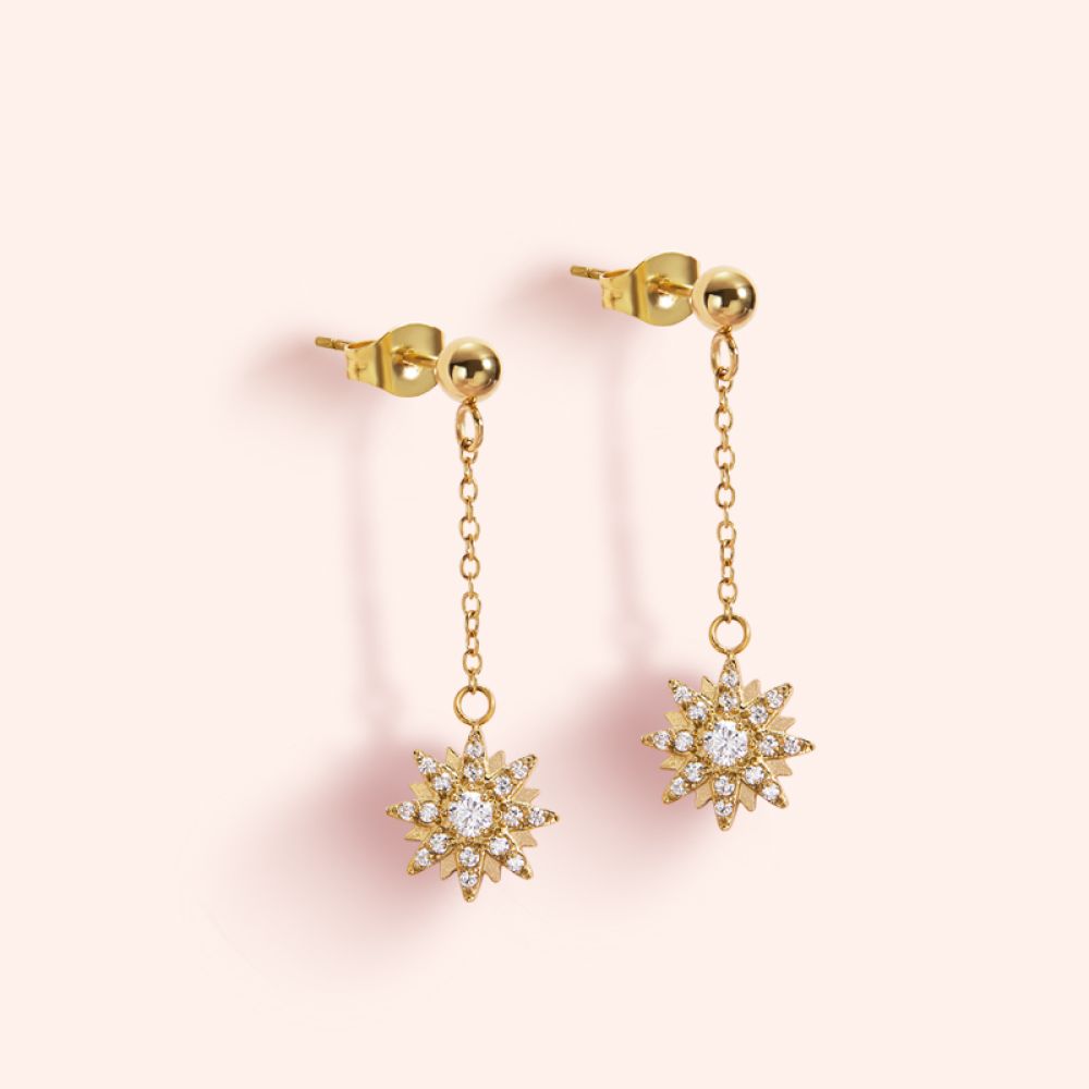 北极星耳环,以锆石为荣,使它们像真正的北极星一样闪耀。这个符号的含义是带来指引、希望和好运。 这些耳环采用 18k 镀金不锈钢手工制作。