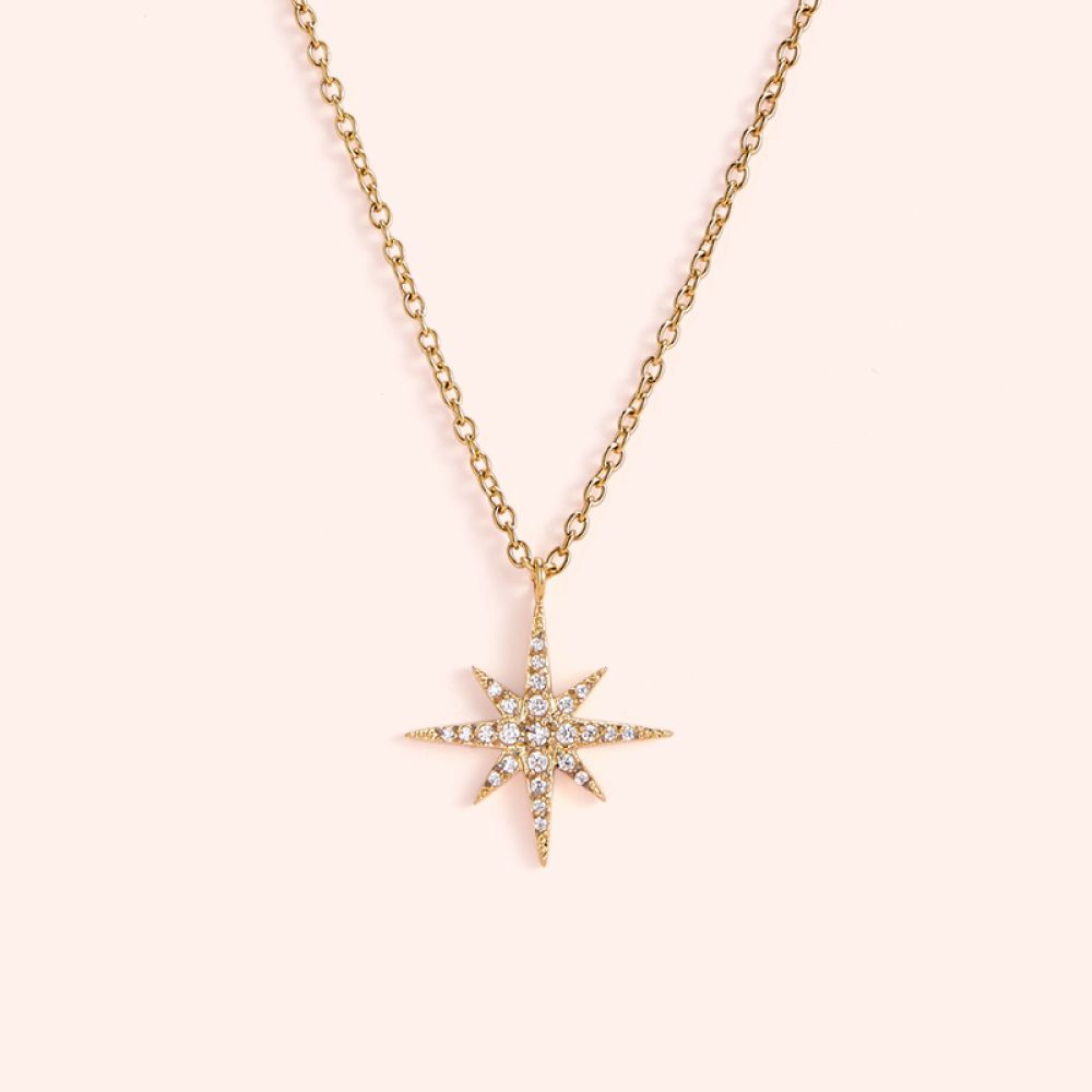 北极星项链,以锆石为傲,让它像真正的北极星一样闪耀。这个符号的含义是带来指引、希望和好运。 这个项链采用 18k 镀金不锈钢手工制作。